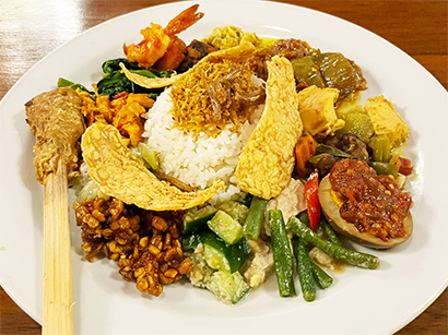 ナシチャンプルは、中央に盛り付けをしたご飯の周りにおかずをのせたワンプレートの料理。 おかずの種類は多岐にわたり、ミーゴレンやサテ、アヤムゴレンなどが定番。 一度にたくさんのインドネシア料理を少しずつ試したい方にはおすすめ。