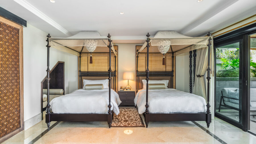 敷地面積約400㎡。マスターベッドルームとダブルベッド2台を配したツインベッドルームを備えた、2階建てのプライベートヴィラです。それぞれのフロアが独立性の高い造りとなっており、まるで2棟のヴィラのようなゆとりある空間構成。ご家族やグループでも優雅な距離感を保ちながら滞在できます。広めのバスルームも2つ完備し、プライベートプールや屋外スペースでは南国らしい開放感を満喫。お部屋からはトロピカルガーデン越しに、その先に広がるインド洋の穏やかな景色が楽しめます。