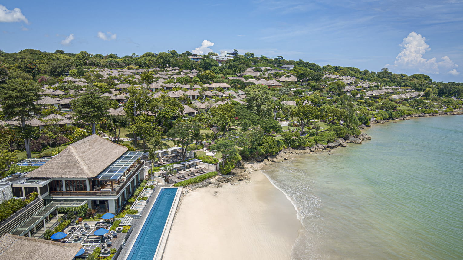 ジンバラン湾を見おろすなだらかな丘に佇むフォーシーズンズ リゾート アット ジンバラン ベイは、全室ヴィラタイプのラグジュアリーリゾートです。156棟のヴィラ&レジデンスは、広大な敷地に集落を形成するように点在し、まるでバリの伝統的な村に滞在しているかのような趣を醸し出します。フォーシーズンズならではのエレガントな客室には、プライベートプールとオープンエアのリビング&ダイニングが備わり、優雅な滞在を演出。バリ様式の寝室やクラシカルな陶製バスタブは、ハネムーナーや女性ゲストの憧れを叶えます。メインプール、テニスコート、フィットネスセンター、スパに加え、レストランやアートギャラリー、ライブラリーなども充実。ファミリーやグループには、別エリアにある2~4ベッドルームのレジデンスヴィラがおすすめで、自由で贅沢な滞在を満喫できます。