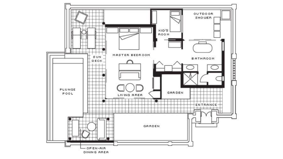 キングベッドとツインベッドを備えた2ベッドルーム ファミリー プレミア ヴィラは、ファミリー向けに設計された320㎡の優雅な邸宅です。マスターベッドルームに隣接する子ども部屋があり、プライバシーと交流のバランスを大切にしています。オーシャンビューの位置にあり、バリの美意識が息づくインテリアとともに、家族の思い出に残る上質な滞在を演出します。