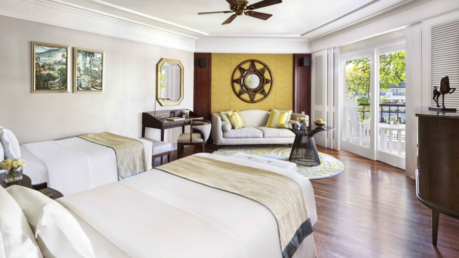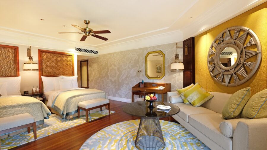 シガラジャウィングの客室で、コロニアルスタイルのインテリアと木のフローリング、大理石バスルームがクラシカルな高級感を演出します。バルコニーからはトロピカルガーデンやラグーンプールを一望でき、専用スペースでの特典付きで優雅な滞在を楽しめます。