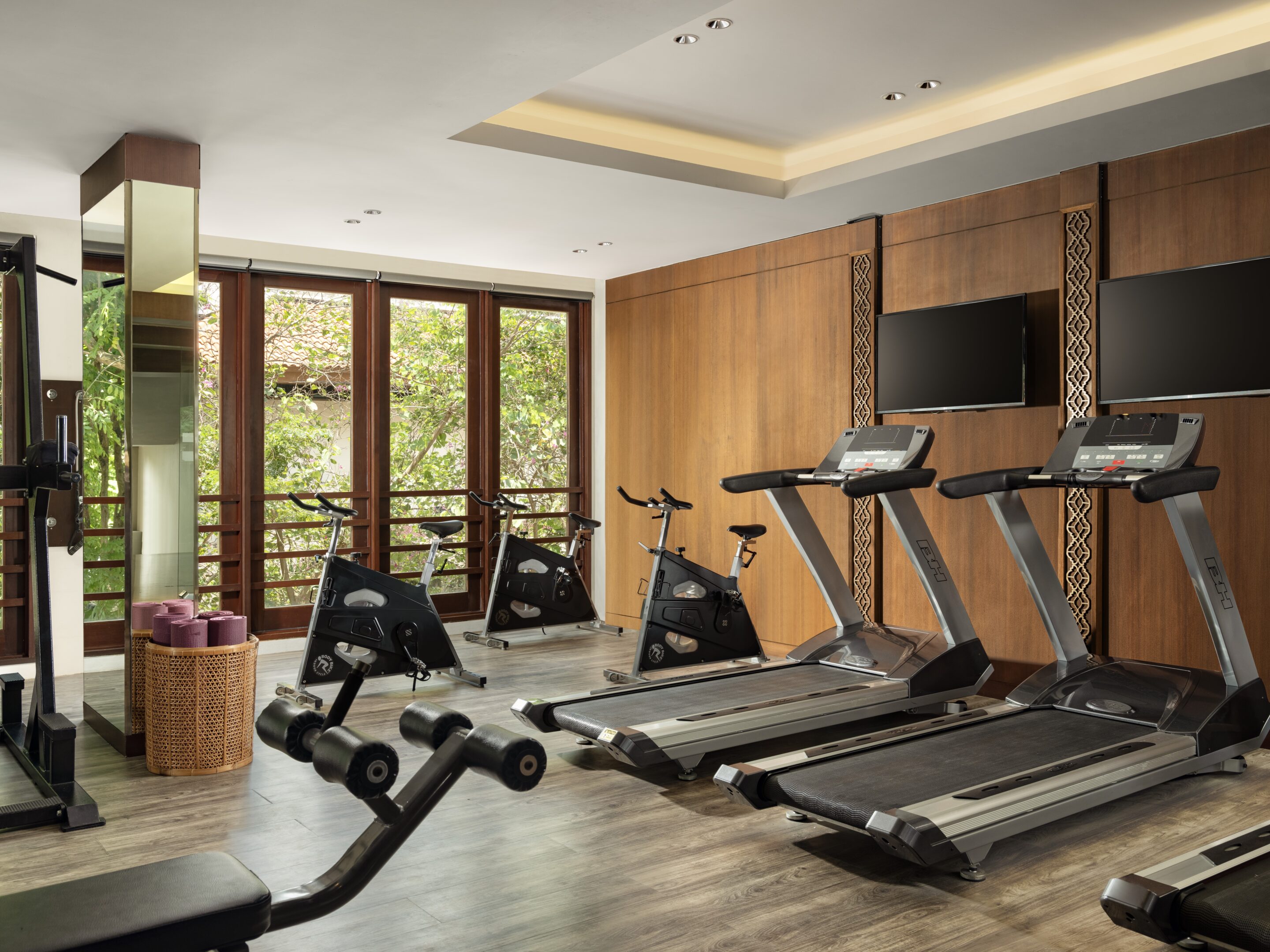 有酸素マシンやウェイト機器を備えたフィットネスセンター。大きな窓から自然光が差し込む開放的な空間で、滞在中も快適にワークアウトが可能です。