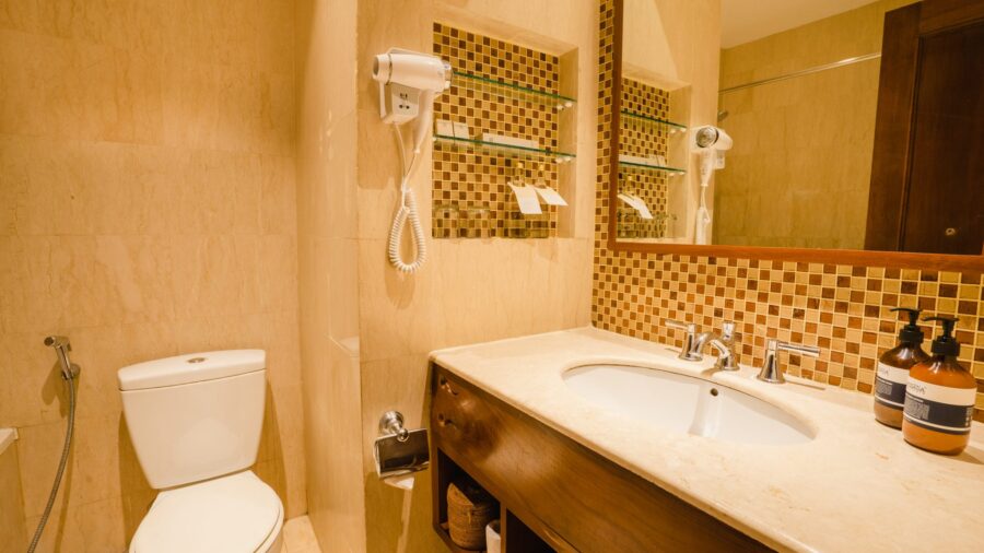 柔らかな色合いのタイルが心地よい、落ち着いたバスルーム