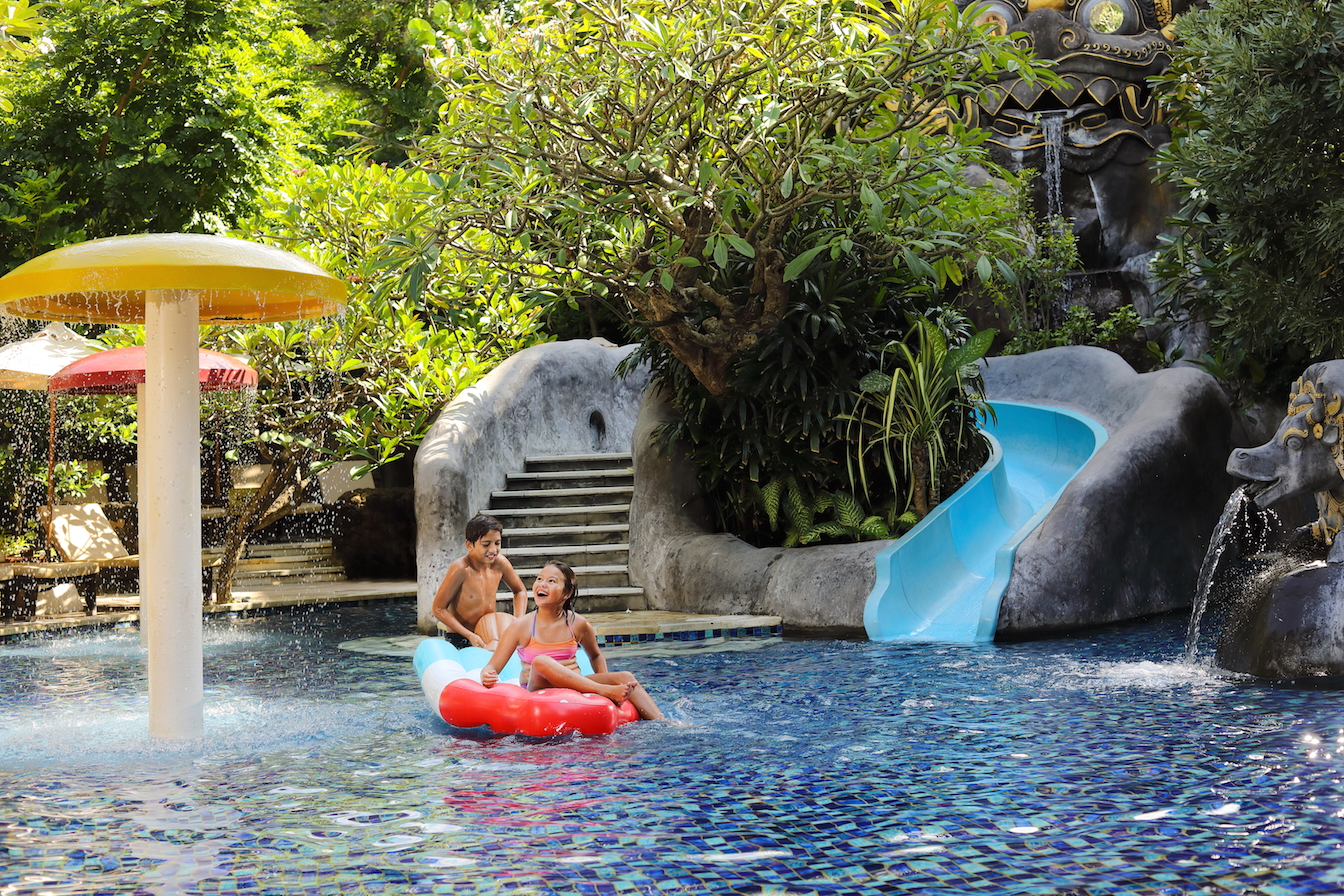 ファミリー棟前に広がるプールは左右に大小のウォータースライダーが設置され、お子様の年齢に応じて使い分けが可能です。プール内では数々の無料アクティビティも催されています。