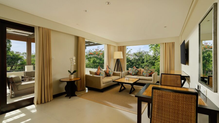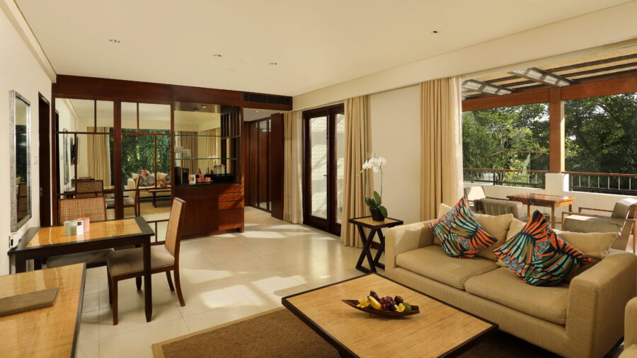 ゆったりとしたオープンエアーのバルコニーが自慢のスイートです。リビングスペースも独立していて、まるで自宅で寛いでいるような素敵な時間が過ごせます。さらに、様々なサービスが楽しめるガーデン クラブラウンジのご利用と宿泊特典も付いています。
