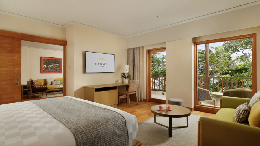 リゾート内に点在するバリスタイルのシャレーの1つデラックススイート。部屋を囲む様に設置されていたバルコニーの一部を客室内に取り込む、広々とした客室です。さらに、様々な宿泊特典やクラブラウンジ利用のサービスも付いています。