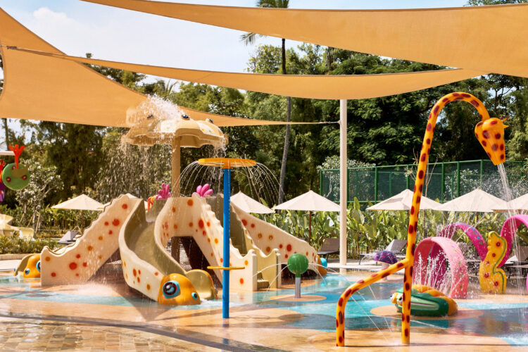 スライダーや水遊び設備を備えたキッズ向けエリア。ご家族で楽しめる設計となっており、お子様連れの滞在をより充実させます。