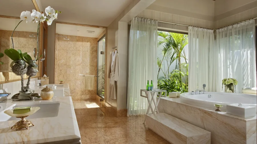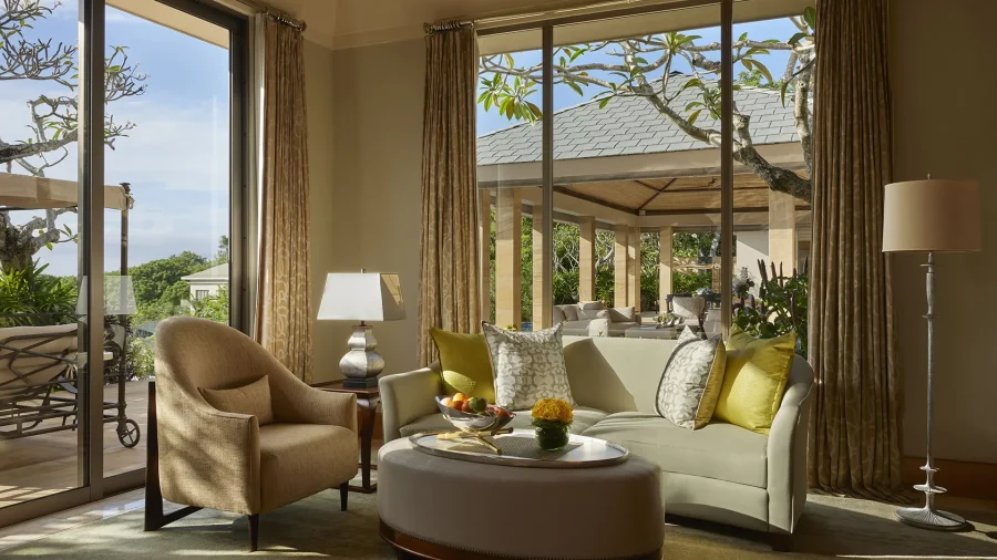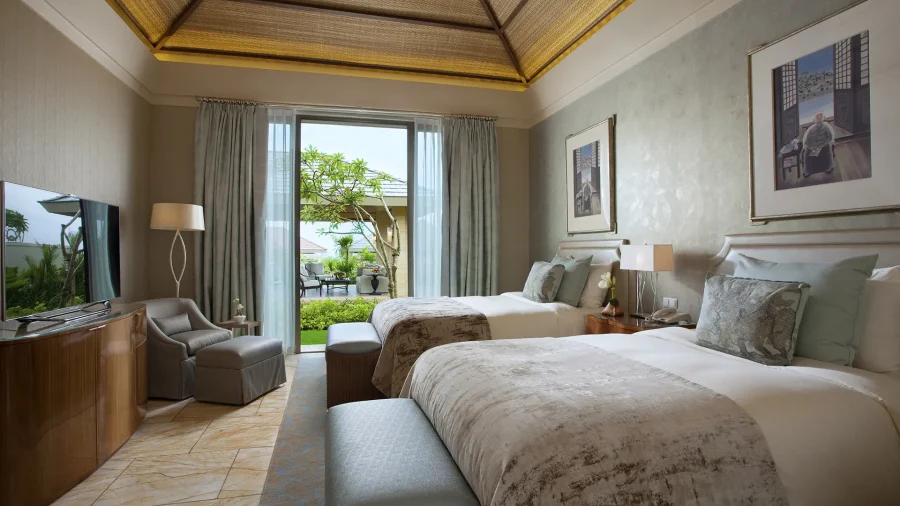 高台エリアに段々に広がるファミリーヴィラ、ガーデンビュー。室内は明るくエレガントで広々としており、屋内外をつなぐオープンエアースペースや、美しいガーデンに囲まれたハイドロテラピープールを完備。家族での滞在でもプライバシーを確保しながら、緑に包まれた落ち着いた環境で贅沢な時間をお楽しみいただけます。(※全室禁煙)