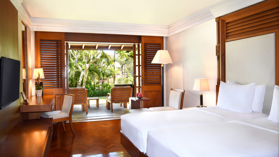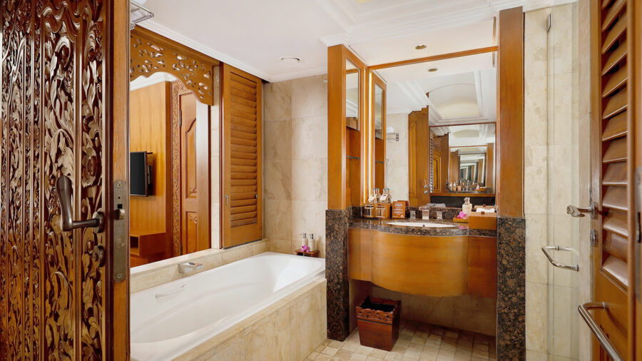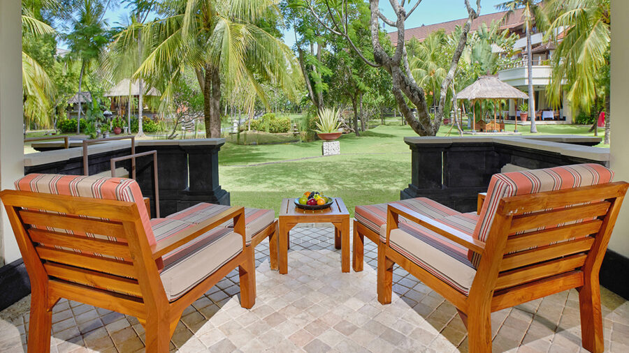 数あるお部屋の中でもワンランク上の滞在ができるのが、パレスクラブルームです。パレスクラブラウンジでは、アラカルトの朝食や、アフタヌーンティー、イブニングカクテルなど、クラブ特典付きのお部屋ならではの数々の特典をお楽しみいただけます。お部屋は約56㎡と広々としており、木の温もりを感じる落ち着いたバリ風のデザイン。バルコニーからは美しい庭園を望むことができ、ゆったりとした時間をお過ごしいただけます。