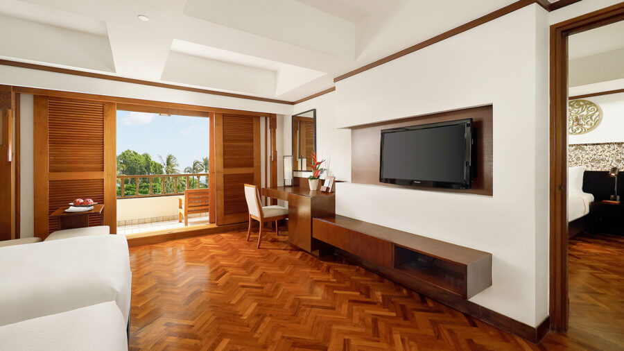 キング(ダブル)とツインのお部屋をコネクティングした4名専用のデラックスルーム。バルコニーは共通で、シャワーのみのバスルーム1ヶ所、トイレが2ヶ所となっているので、ファミリー利用をおすすめします。