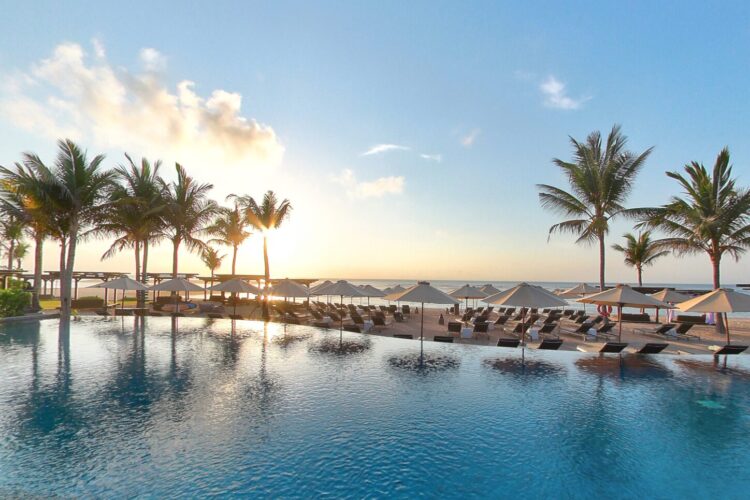ヌサドゥアの白砂ビーチとインド洋を望む絶好のロケーションに位置するインフィニティプールは複数の層で構成されており、ヤシの木に囲まれ、南国の雰囲気を演出しています。プールサイドのデイベッドやビーチチェアでのんびりとくつろげるほか、キッズプールも完備されており、家族連れにも最適です。