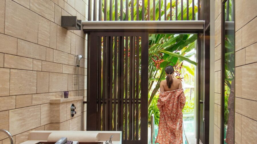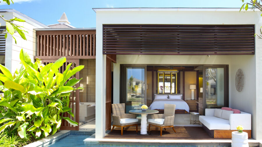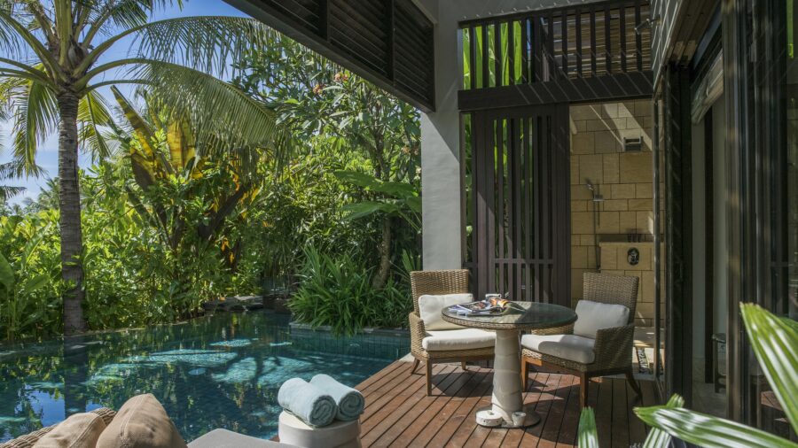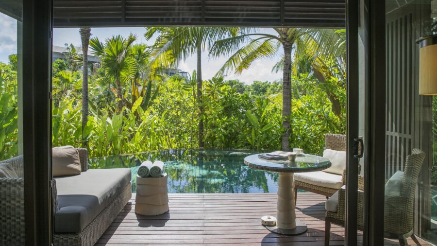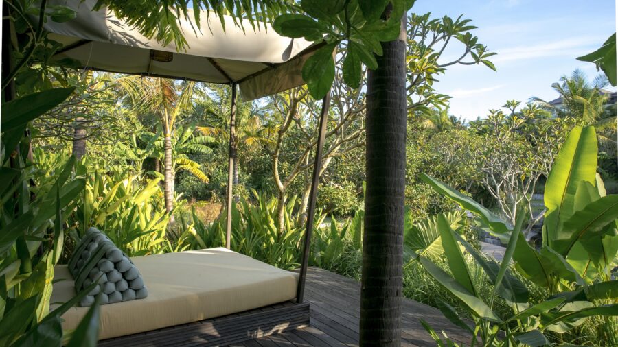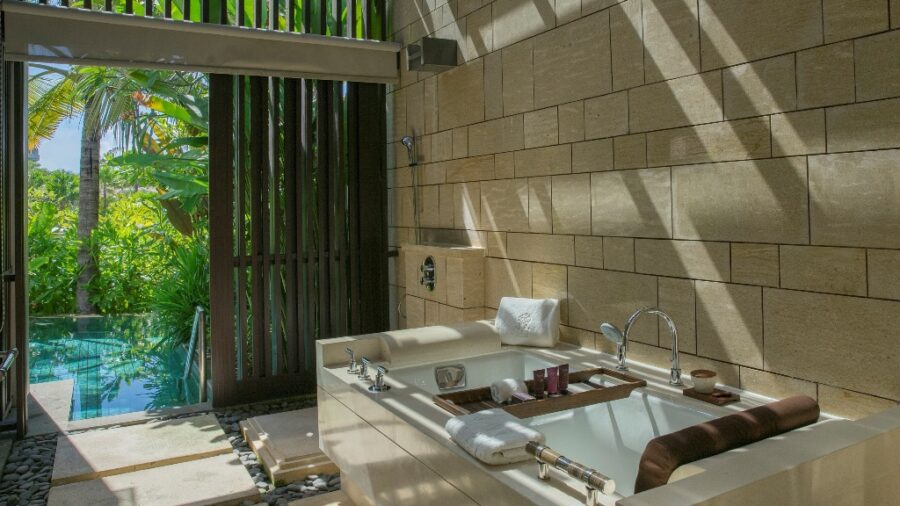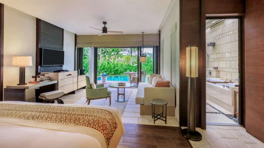 モダンな内装とトロピカルな島の雰囲気が調和したパヴィリオンヴィラには、豪華なベッドルームとリビングルームが備わっています。38㎡の広々としたプライベートベランダには、大きなデイベッドやダイニングテーブルが設置されており、屋内外問わず快適にお過ごしいただけます。エアコン完備の室内には、インドネシア風のインテリアが印象的なリビングルームと、バリらしい高い天井が開放感を演出するベッドルームをご用意。ベッドルームにはスーパーキングサイズベッド、またはクイーンサイズベッド2台を備えております。また、半屋外のバスルームからは美しい景観を楽しめるだけでなく、十分なプライバシーも確保されており、広々としたプールへ直接アクセスが可能です。特大のバスタブとシャワーに加え、室内には別途シャワーとダブルシンクの洗面台を完備し、快適さとラグジュアリーを兼ね備えた空間を提供しています。