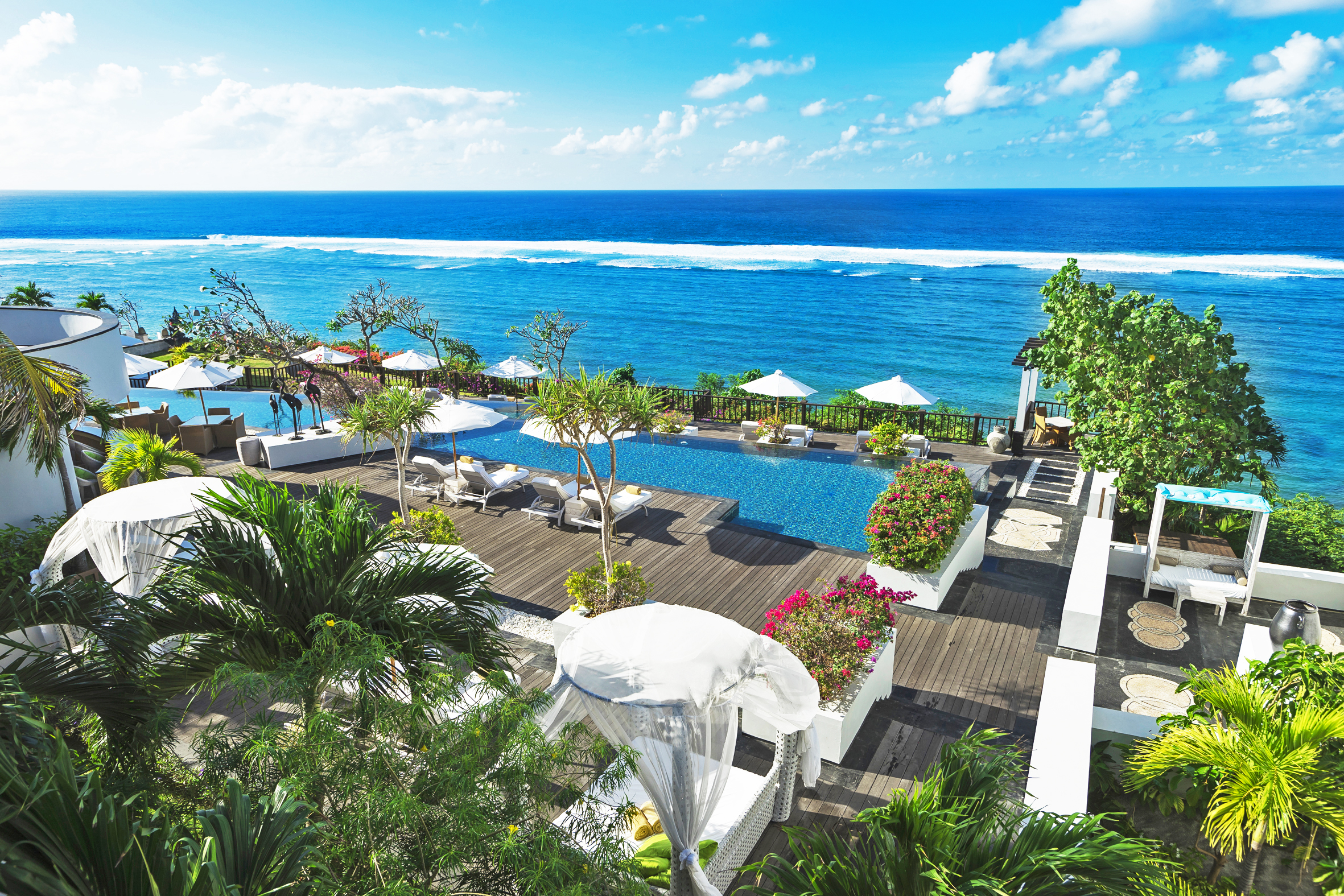 サマベ バリ スイーツ&ヴィラスは、全室オーシャンビューの絶景ラグジュアリーリゾート。ヌサドゥア南部のインド洋を見渡す崖の上に建ち、白を基調としたモダンデザインと伝統的バリ建築が調和した美しい外観が印象的。ホテル棟からオーシャンビューは、ヌサドゥアのホテルの中で随一の絶景。眺望にこだわりのあるお客様に是非おすすめをしたいホテルのひとつです。大海原を眺めながら、至福の休日をお楽しみください。