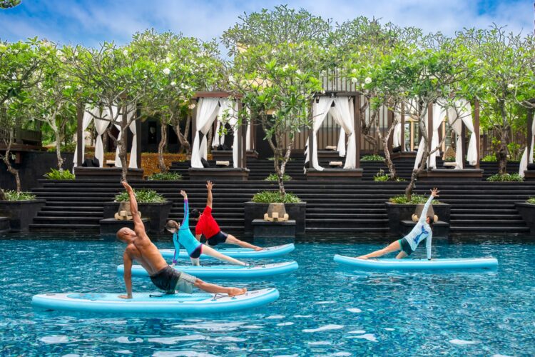 カユプティレストランの前・ビーチフロントにあるメインプールでは、SAP(スタンドアップパドルボード)を使ったヨガなどのアクティビティーも開催されます。