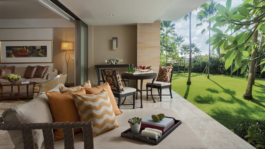 独立したリビングルームとベッドルームを備えた、ゆとりあるスイートタイプの客室。バルコニーにはプライベートジャグジーが設えられ、緑に囲まれた開放感の中で、贅沢なリラックスタイムをお過ごしいただけます。ザ ムリア共通の重厚感あるバスルームや上質なインテリアが、滞在をより特別なものに。ガーデンの眺めとともに、静かで洗練されたリゾートステイをご堪能ください。(※全室禁煙)