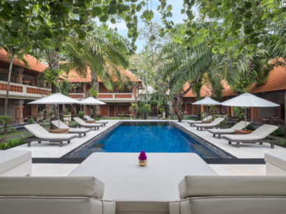 バリ島サヌールにあるグリヤ サントリアンは、1972年開業の老舗リゾート。近年少しずつ開発が進むサヌールにありながら、どこかのんびりとした素朴な空気が今も残る、居心地のいいビーチリゾートです。客室は、バリらしい伝統建築を取り入れた2階建てタイプとバンガロータイプ。ダークブラウンを基調にした家具やインテリアが、ほどよくエキゾチックな雰囲気を演出してくれます。昔ながらの温かみはそのままに、定期的にリノベーションされているので、清潔感のある快適な空間が保たれています。敷地内には3つのプールのほか、レストランやスパも揃い、ホテルの中だけでもゆったり過ごせるのが魅力です。さらに外に出れば、整備されたサヌールビーチと遊歩道がすぐ目の前。散歩やサイクリングを楽しむ人で日々賑わいを見せています。リゾートでのくつろぎと、街歩きの楽しさ。そのどちらも叶えてくれる、サヌールらしさに満ちた一軒です。