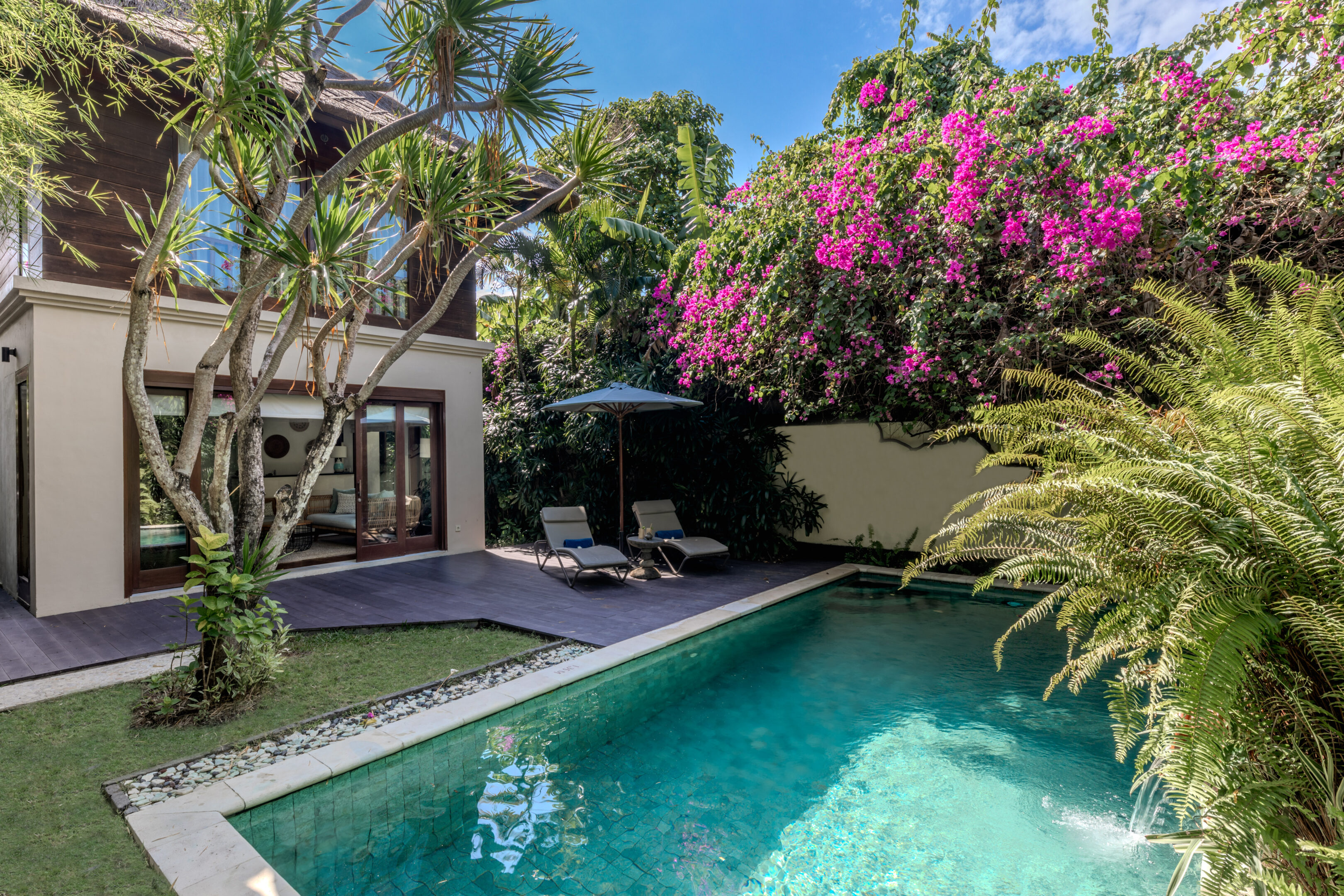 1階にリビング&ダイニング、2階にベッドルームを配したメゾネットタイプ。どこか可憐でロマンチックなインテリアが印象的で、ハネムーンやカップル滞在にぴったりの一棟です。滞在の時間そのものを楽しむ、隠れ家のようなヴィラです。