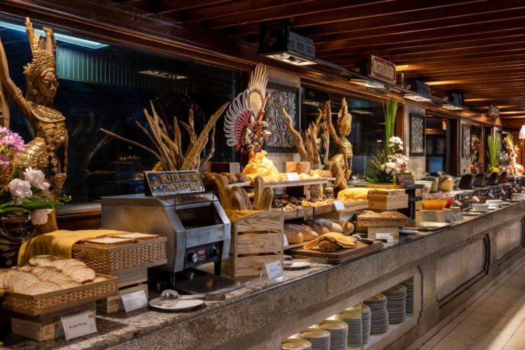 ホテルのメインダイニング。朝はビュッフェ形式の朝食会場となり、卵料理やフルーツ、インドネシア料理などを揃えます。日中〜夜はアラカルト中心で、インターナショナルメニューを幅広く提供。プールサイドに位置し、肩肘張らずに使えるオールデイレストランです。