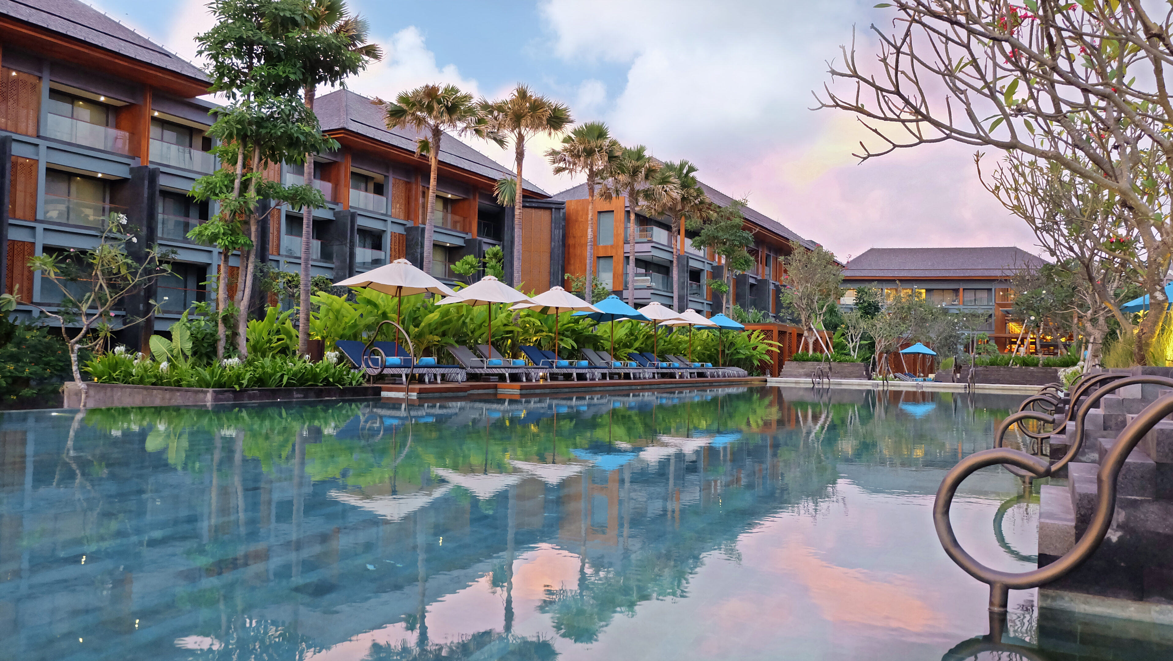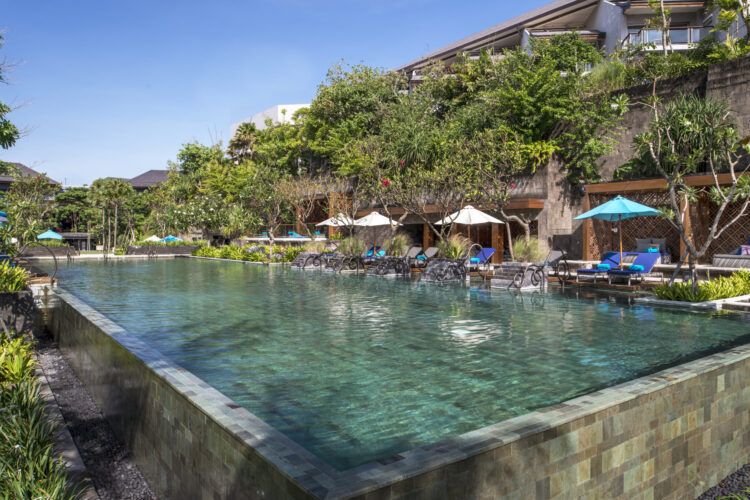 リゾート内中央に位置するメインプールは、遠くに海を望むインフィニティープール。ホテル棟やガーデンと調和のとれたデザインは、バリの村を流れる川の様相を呈しています。