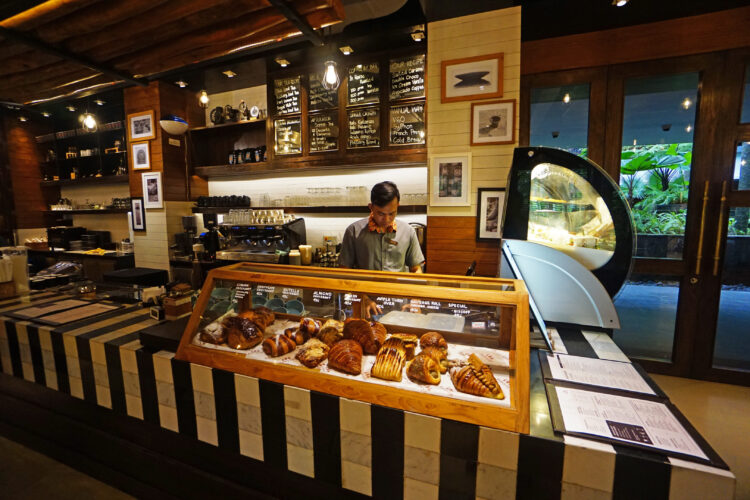 メイン棟1階に位置するポタリ―カフェは、作り立ての上質なパンやサンドウィッチ、ペストリーとともにインドネシア産の紅茶やコーヒーを楽しめるお洒落なカフェです。壁際にはバリ島の有名な陶磁器工房のひとつ、ケヴァラ(Kevala)出身のアーティストの作品が並びます。