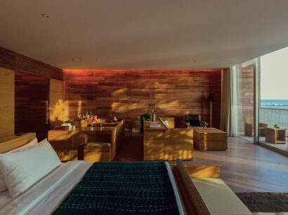 スイート棟にある82㎡のアイランドスイートは、北欧家具に囲まれ、キングベッド、バスタブ、プライベートバー完備で、バルコニーからリゾートビューを望み、ビーチライフもリゾートライフも愉しみたいGOHおすすめの客室です。