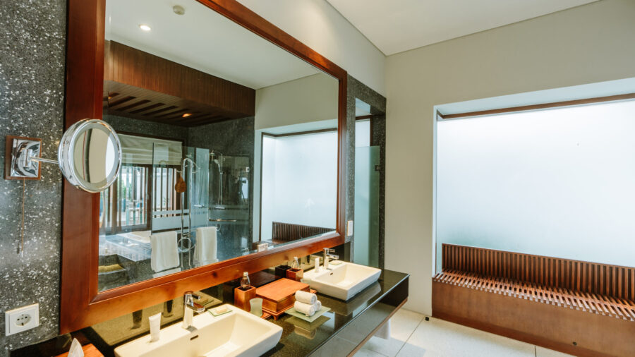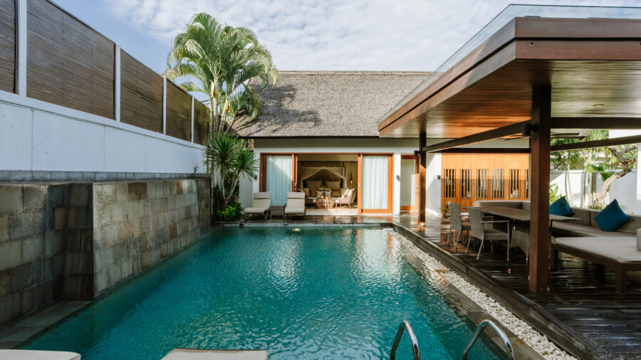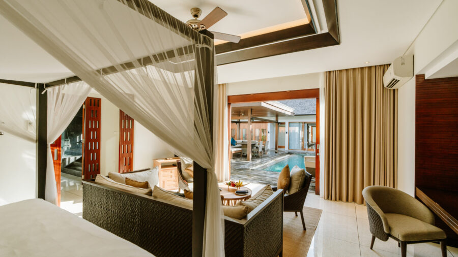 ビーチフロントから一歩奥まったロイヤルコートヤードエリアに佇むこのヴィラは、約410㎡もの広大な敷地を誇ります。静謐なプライベートプールを中心に、エレガントな1ベッドルームヴィラが2棟、調和を描くように配置。各ヴィラには、上質な寝室と、バスタブ付きバスルーム、セパレートシャワーブースが備わり、細部にまで快適さと美意識が息づいています。