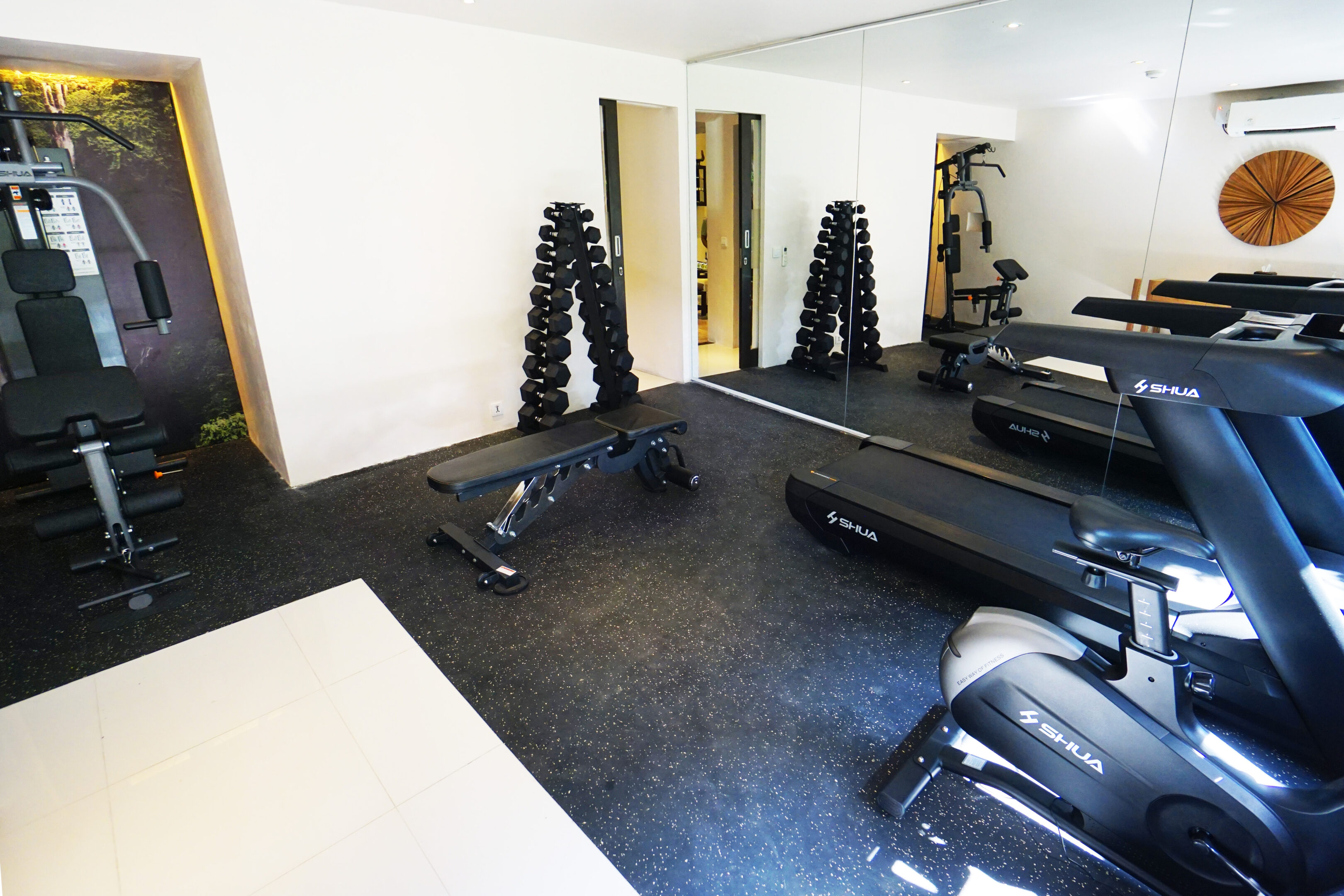 こじんまりとしたジムながら、トレッドミルやエアロバイク、ダンベルが揃い、有酸素から無酸素まで気軽にトレーニング可能。滞在中の軽い運動習慣をサポートする静かな空間です。