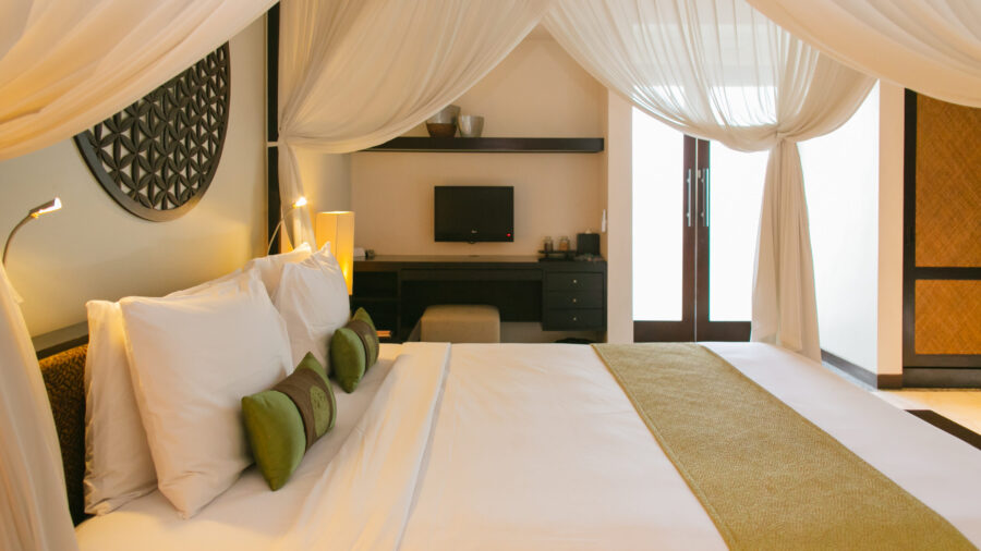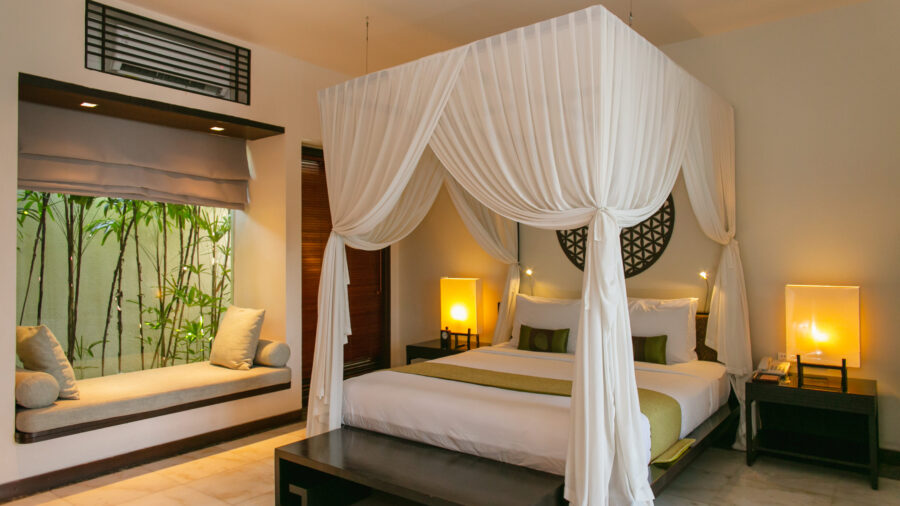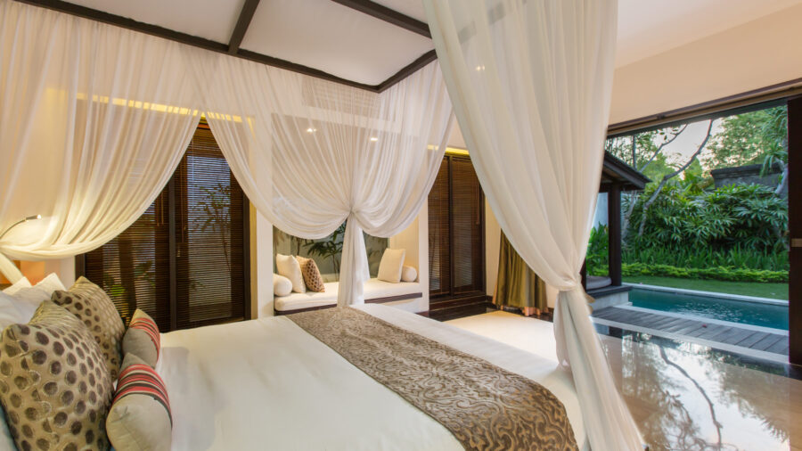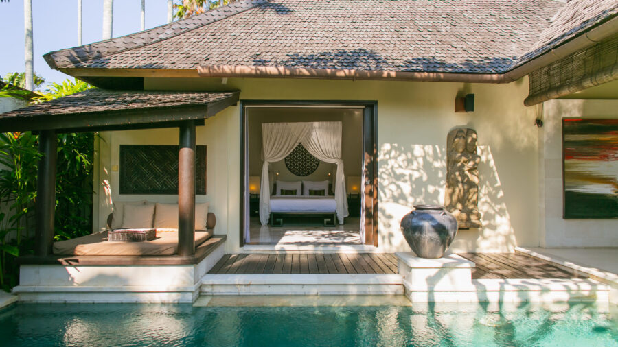 ベッドルームの先には、手入れの行き届いたガーデンと静かに水を湛えるプール