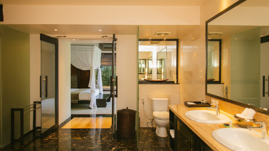 ゆとりあるバスルームには、大きなバスタブとダブルシンクが配されている