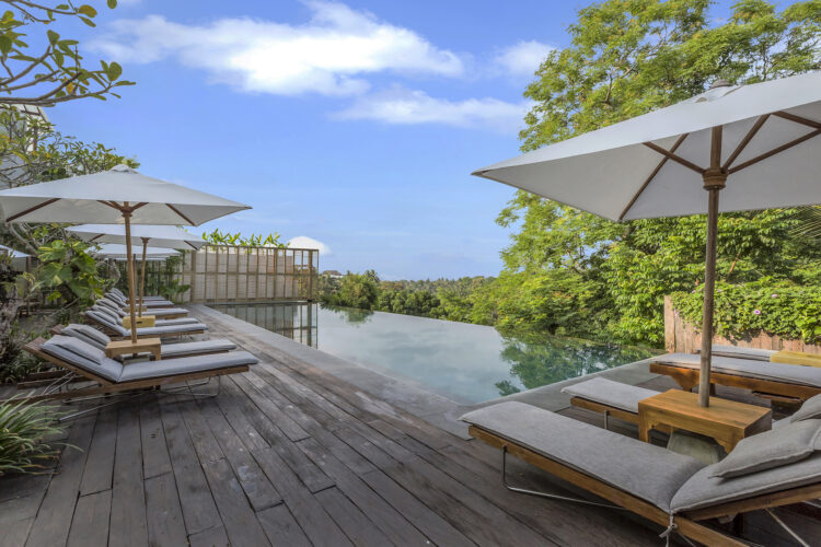 ウブドのジャングルを見渡すインフィニティプール。森の景色に溶け込むように造られた温水プールで、昼間は爽やかな森の風を感じながら、夜は静かな雰囲気の中でゆったりと過ごせます。宿泊者専用の落ち着いた空間です。