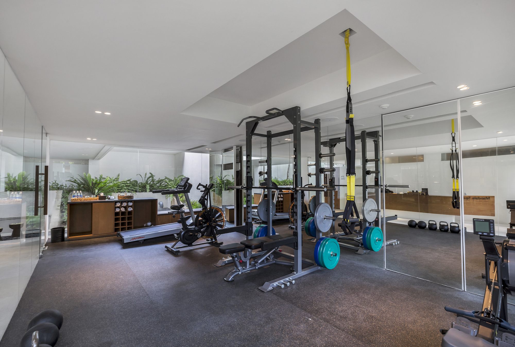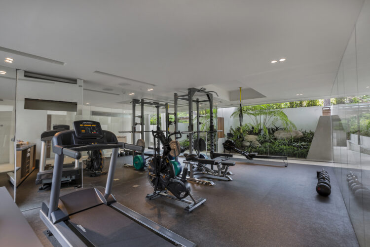 ヴィラエリア内にあるフリーウェイトゾーンを持つジム。大きなガラス窓から自然光が差し込み、落ち着いた雰囲気の中で、本格的なトレーニングができます。ヴィラ宿泊者の滞在スタイルに合わせた静かな空間です。