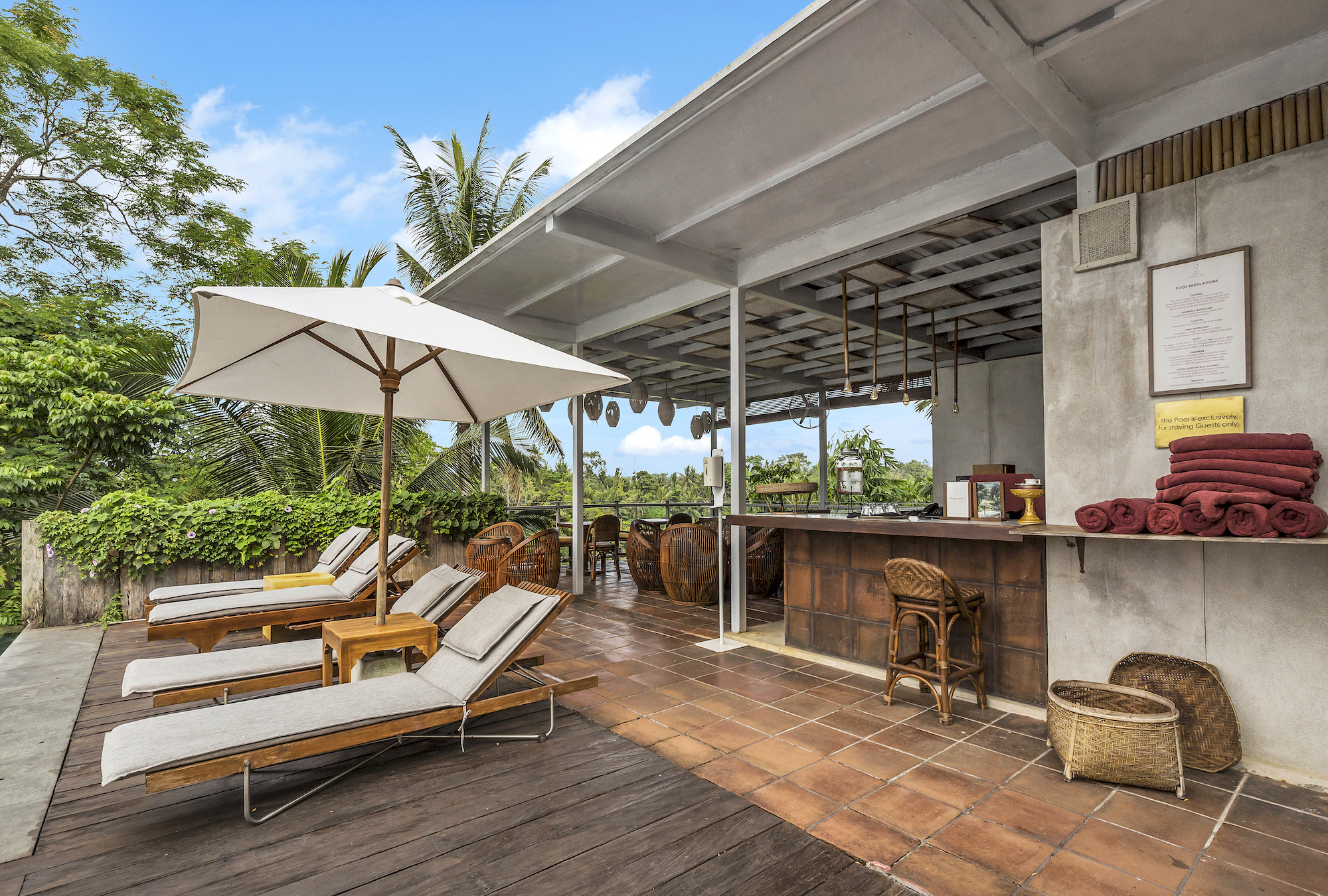 インフィニティプールのすぐ横に位置するプールパビリオン。カクテルやフレッシュジュース、軽食を楽しみながら、ウブドの緑に囲まれた開放的なプールサイドでゆったりとした時間を過ごせます。