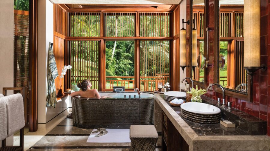 ベッドに寝そべりながら、ウブドの自然とプライベートプールを眺める贅沢