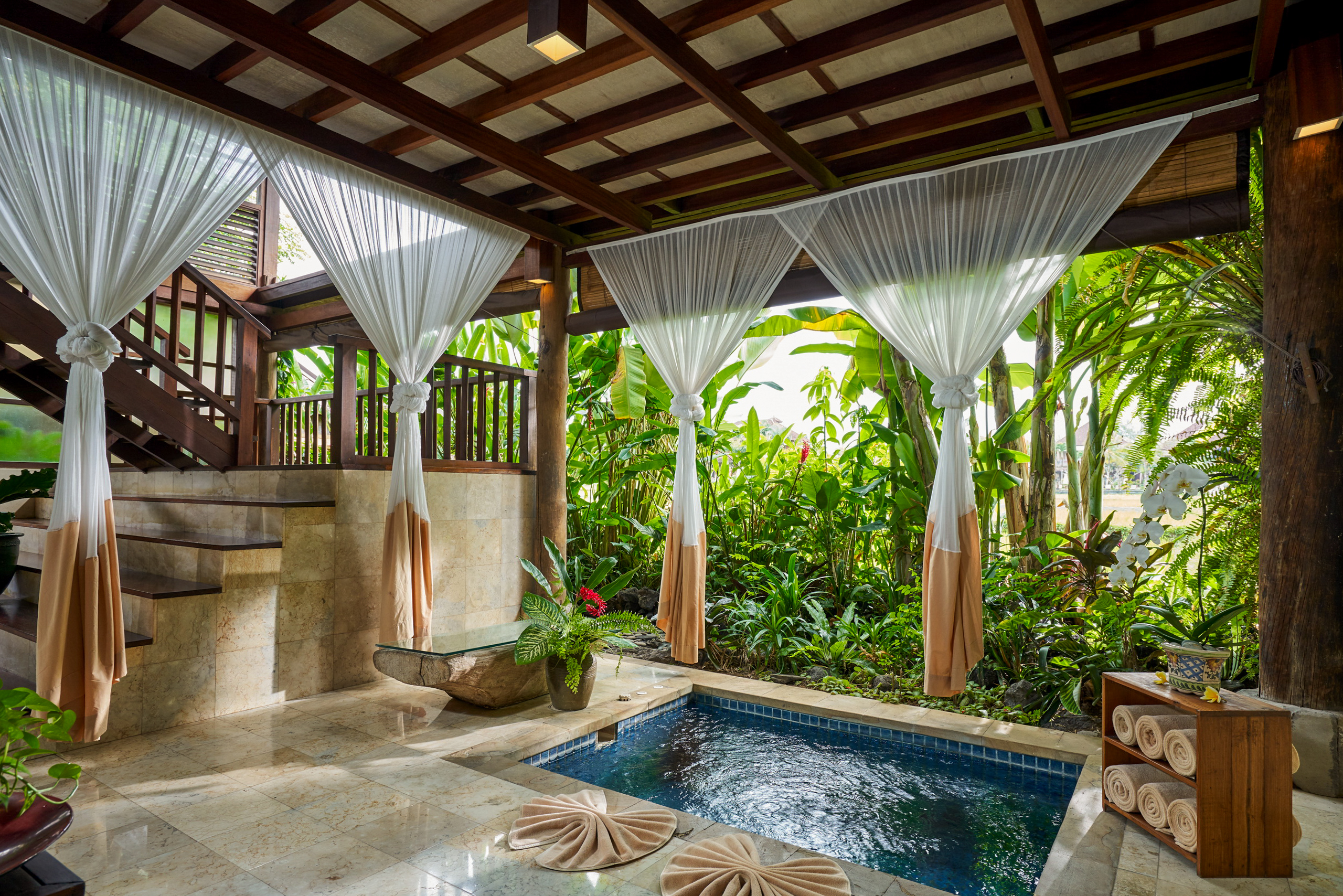 緑豊かな木々に囲まれた、2階建てのコテージ風スパ施設。