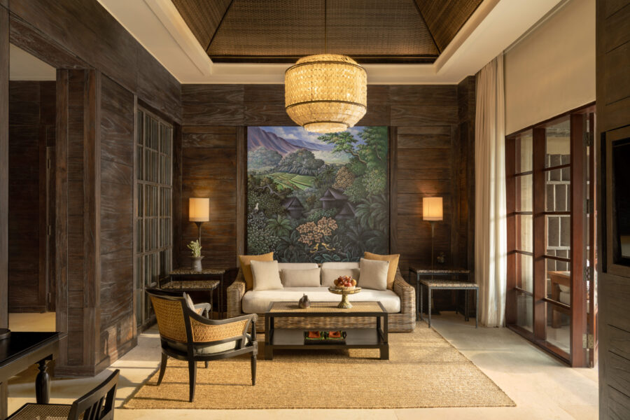 ホテル棟に位置する100㎡のゆとりあるスイート。セパレートされたリビングとベッドルーム、ライステラスを望む穏やかな眺望、クラシカルなバスルームなど、上質な滞在を叶えます。マンダパの世界を存分に味わえる、GOHおすすめの客室です。