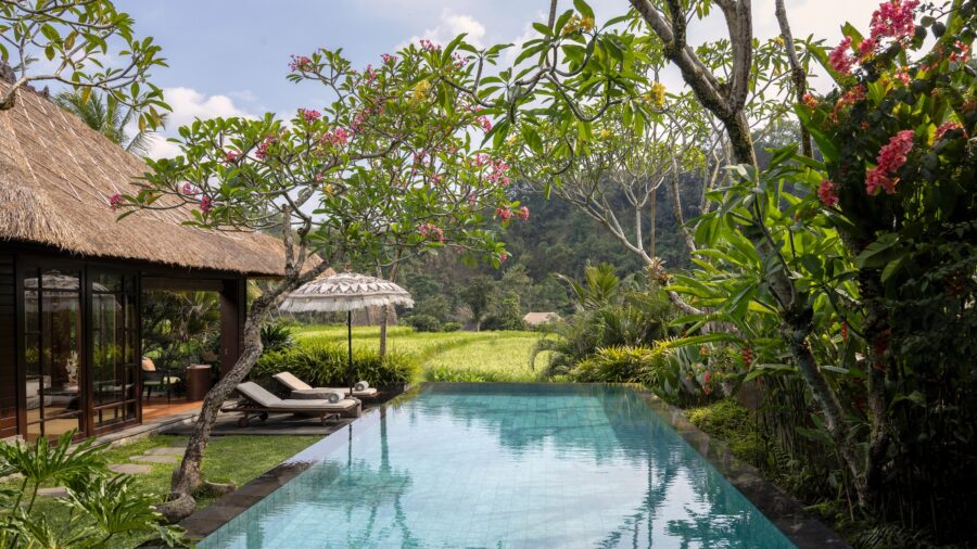 敷地面積430㎡を誇るプライベートプール付きヴィラ。リビングとベッドルームが独立したゆとりある設計に加え、広いガーデンとプールが備わり、ウブドらしい自然に囲まれた滞在が叶います。伝統的なバリ建築を取り入れた温もりある空間は、カップルやハネムーナーにも最適。静かな自然に包まれながら、贅沢なプライベート時間を楽しめます。