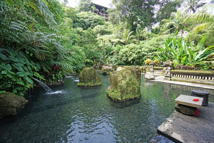 リゾート内の崖下に位置する湧水を使用したプールは、聖なる水としてリゾート内で大切に扱われています。