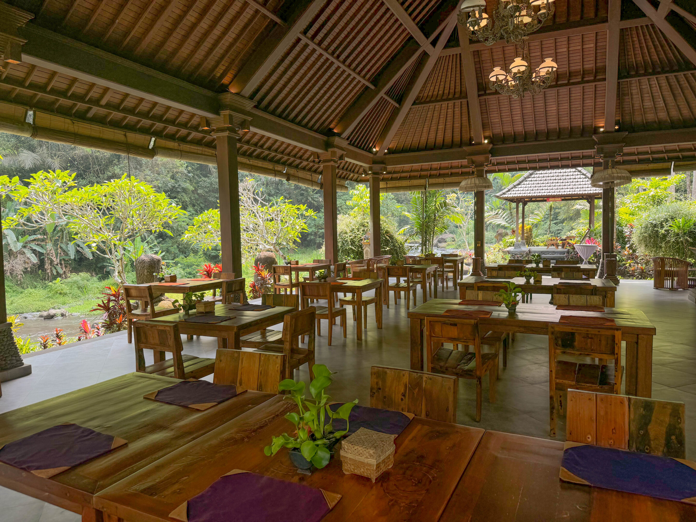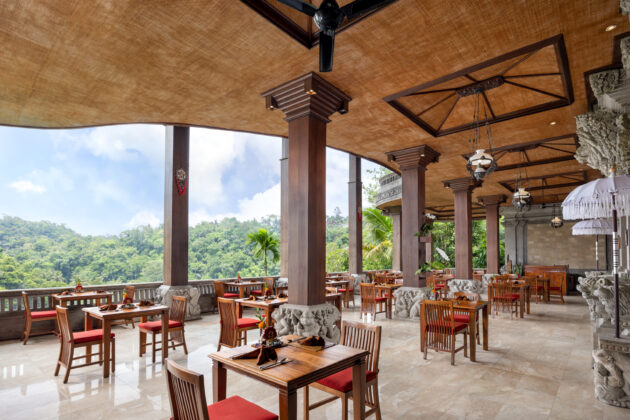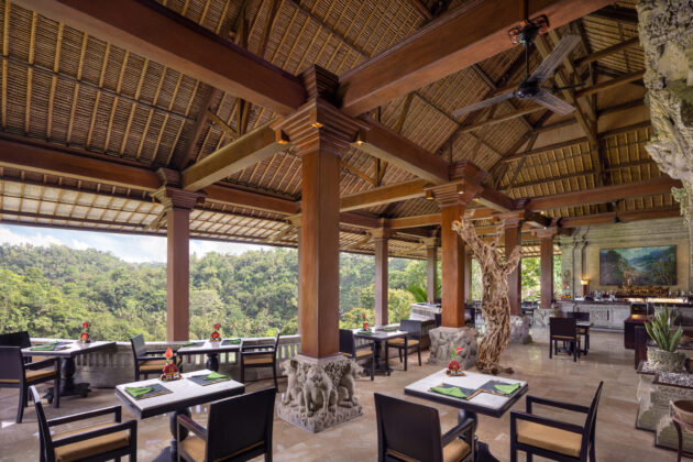 アユン川のほとりに建つこのレストランは、その名の通り有機野菜や果物を中心としたメニューを提供しています。インドネシアの伝統建築を取り入れた造りで、あえて壁を設けず、川から吹き抜ける涼風が店内を心地よく満たすよう工夫されています。