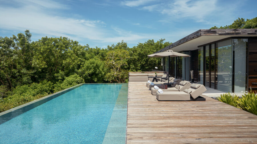 丘の緑に囲まれたロケーションに建つ3ベッドルームヴィラ。広々としたリビングやダイニング、プール付きのテラスを備え、プライベートな別荘のような滞在が叶います。自然を感じながら、グループでの滞在を心地よく支えるゆとりある設計です。