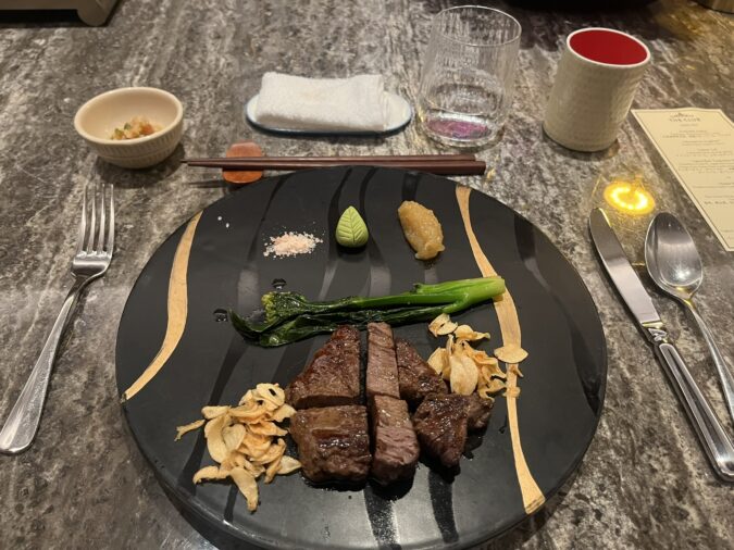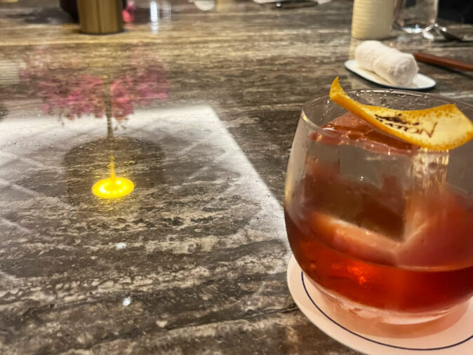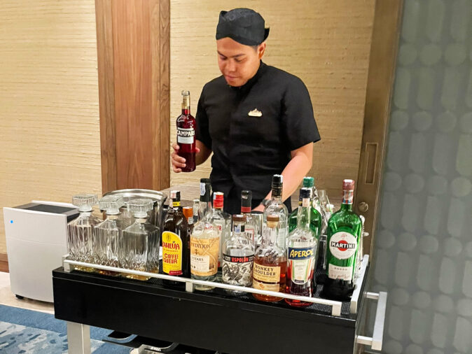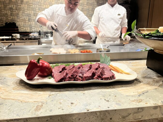 メインは但馬牛のステーキです。鉄板を使って、私たちの目の前でステーキを焼いて頂きます。付け合わせにはワサビもあり、日本の食材や風味を取り入れたディナーに大満足の夜でした。料理を待っている間にはウェイトレスさんがやってきて、目の前でカクテルを作ってくれます。私は、このホテルのシグネチャーカクテルである“KERATON NEGRONI(クラトン ネグローニ)”を頂きました。柑橘系のさっぱりとしたカクテルは、ジャカルタの暑い夜をさわやかに彩ってくれます。