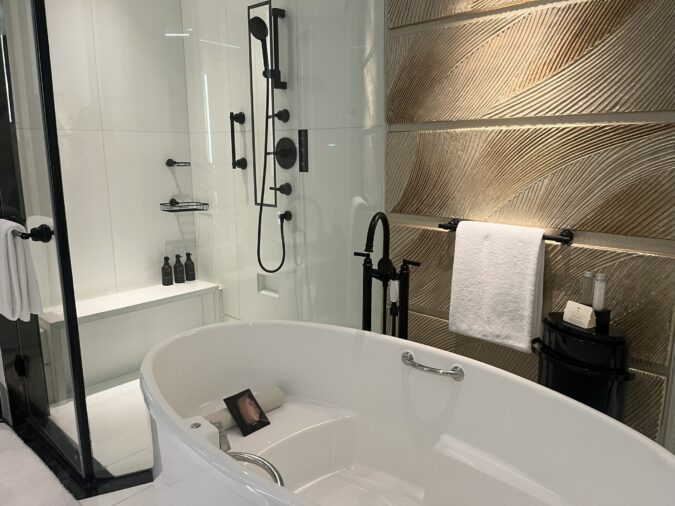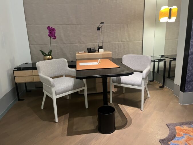 扉を開けた瞬間にまず驚くのはお部屋の大きさです。64㎡のお部屋にはゆっくりとくつろげるソファーに、外の景色を楽しみながら食事もとれるテーブル、そして部屋の中央にはキングサイズのベッドが。当然ながら1泊ではもったいないホテルです。
