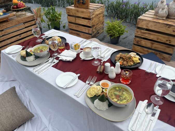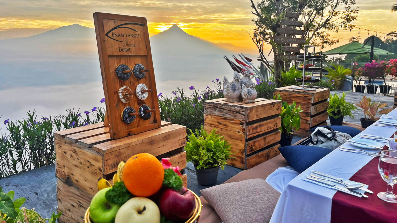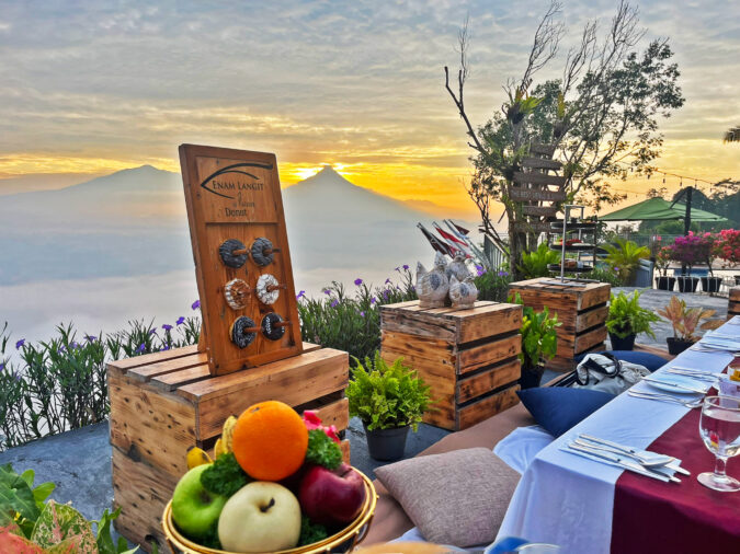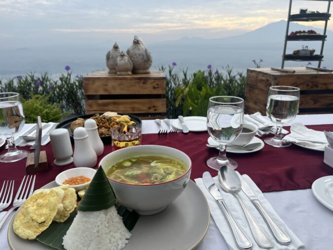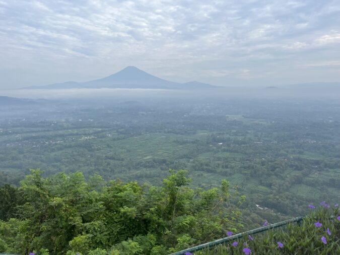 標高650mのところにあるこのプラタランシャイレンドラは、上からボロブドゥール寺院をはじめ、ジョグジャカルタの街を一望できるほか、朝はムラピ山の頭から昇るサンライズを楽しむことが出来ます。営業時間が5:00~20:00となっているので、朝食だけでなく、ランチ、ディナーを楽しむことが出来ます。今回はサンライズを見ながらのブレックファストというプランでしたが、ジョグジャカルタの山々に囲まれながら最高のロケーションで食事をお楽しみ頂けるレストランになっています。