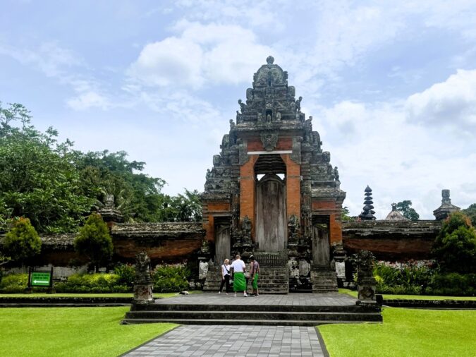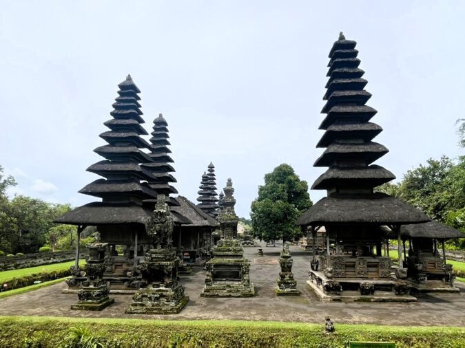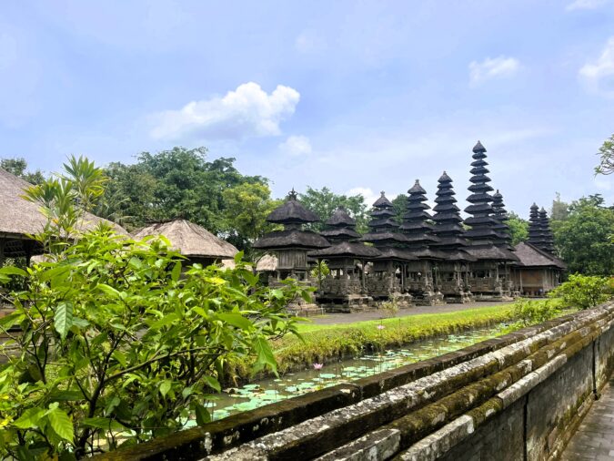 敷地内の遊歩道を歩き進めていくと大きな門が。この門は「チャンディクルン」と呼ばれており、魔よけの門として知られています。この門の向こうにタマンアユン寺院を象徴する「メル」が並びます。「メル」とは、ヒンドゥー教世界の中心にそびえる聖なる山を表しており、古くからその山には神が宿ると信じられてきました。そのため、山の形を模した多重塔には神々が宿るとされ、非常に神聖な存在とされています。基本的に門の中へは信者以外の人が入ることは許されておらず、観光客はメルを囲む壁に沿って中を見学します。