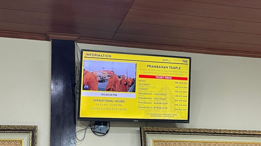 昼食後、いよいよプランバナン遺跡へ向かいます。プランバナン遺跡の入場料は、2024年現在大人400,000ルピア(4,000円)となっており、周辺のボコの丘やボロブドゥール遺跡との共通拝観のチケットも販売されています。また遺跡内はボロブドゥールと同じく公園として整備をされており、敷地も広い印象です。基本は徒歩での移動となりますが、公園内で利用可能なレンタサイクルも用意されています。