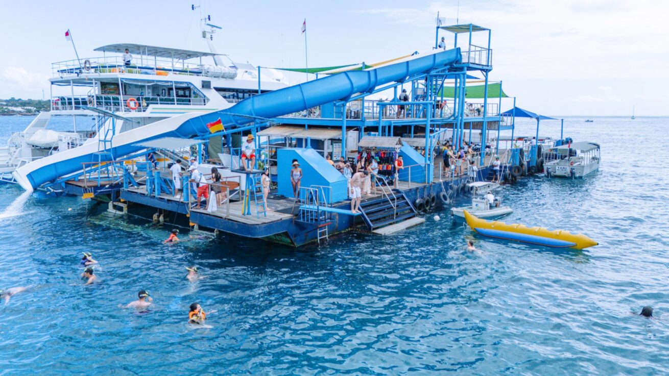 豪華カタマランでレンボンガン島へ向かうデイクルーズ。専用ポントゥーンではシュノーケリングやバナナボート、ウォータースライダーなどのマリンアクティビティを満喫できます。プライベートビーチクラブではトロピカルブッフェランチやラグーンプールでのんびりと過ごすことも可能。海遊びとリゾート気分を一日で楽しめるクルーズです。